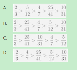 请比较的2/3,4/7,5/12,10/31,25/41大小,以下选项中正确的是()。